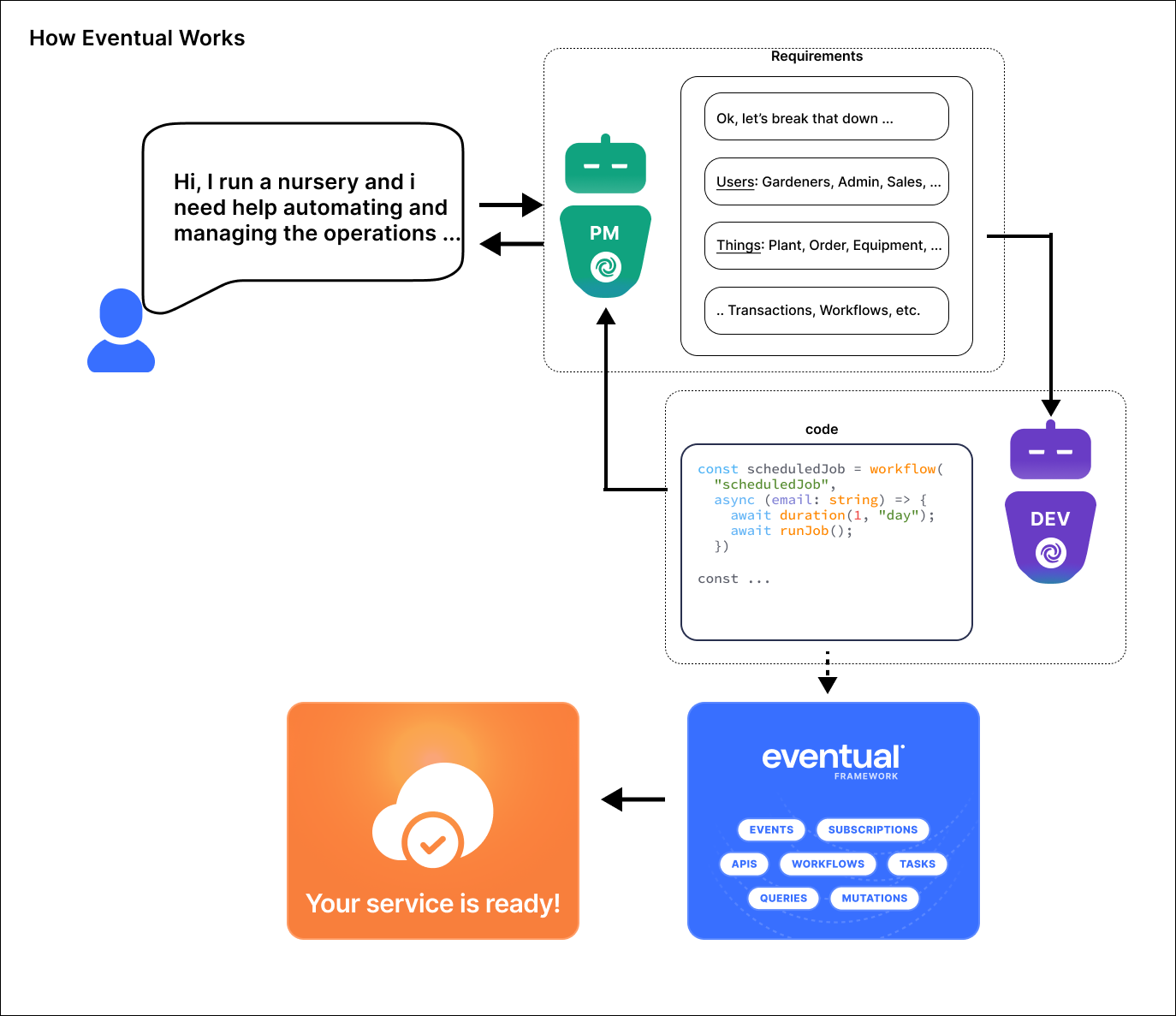 eventualAi is a companion autonomous software development team of smart agents who know how to use the eventualCloud framework and apply Domain Driven Design (DDD) principles to translate business requirements into functioning services. Feed it your business problem or domain in natural language and have it “print” on-demand, scalable and fully serverless solutions.